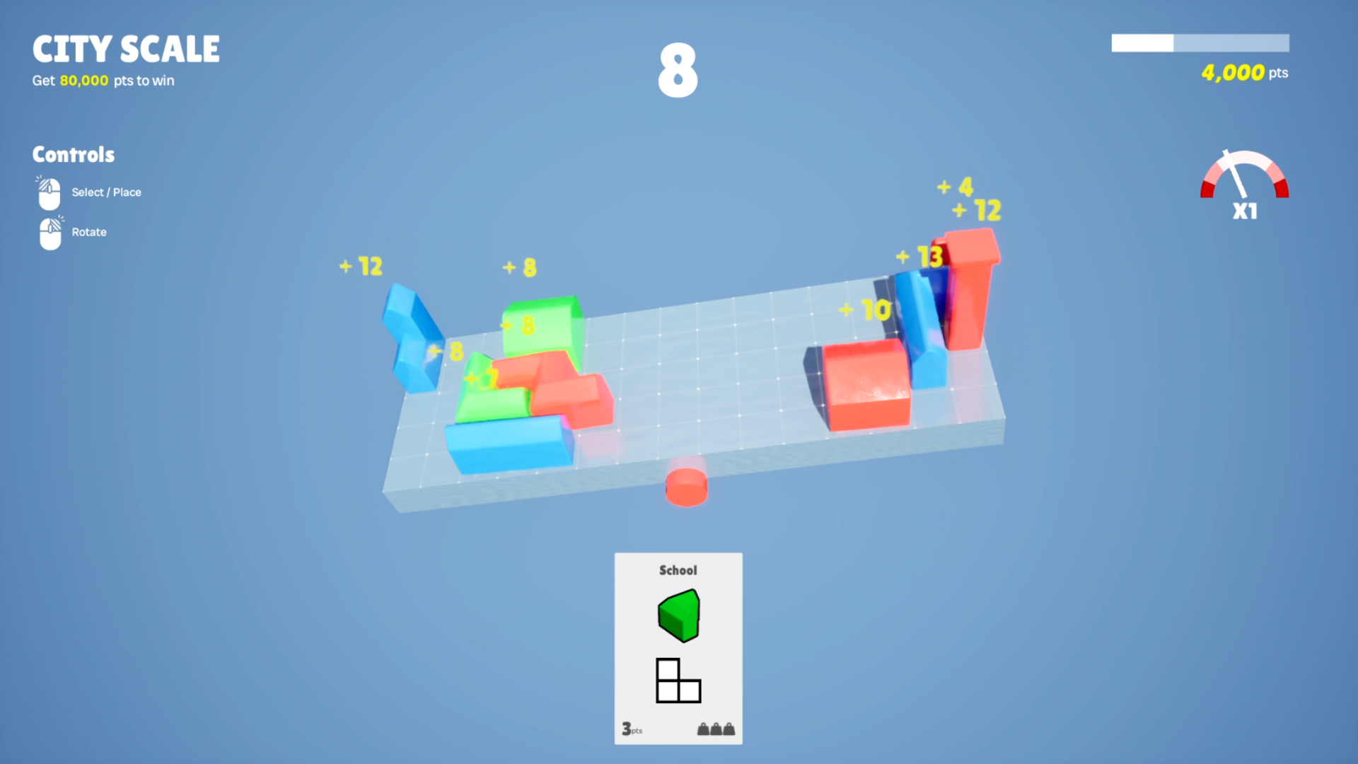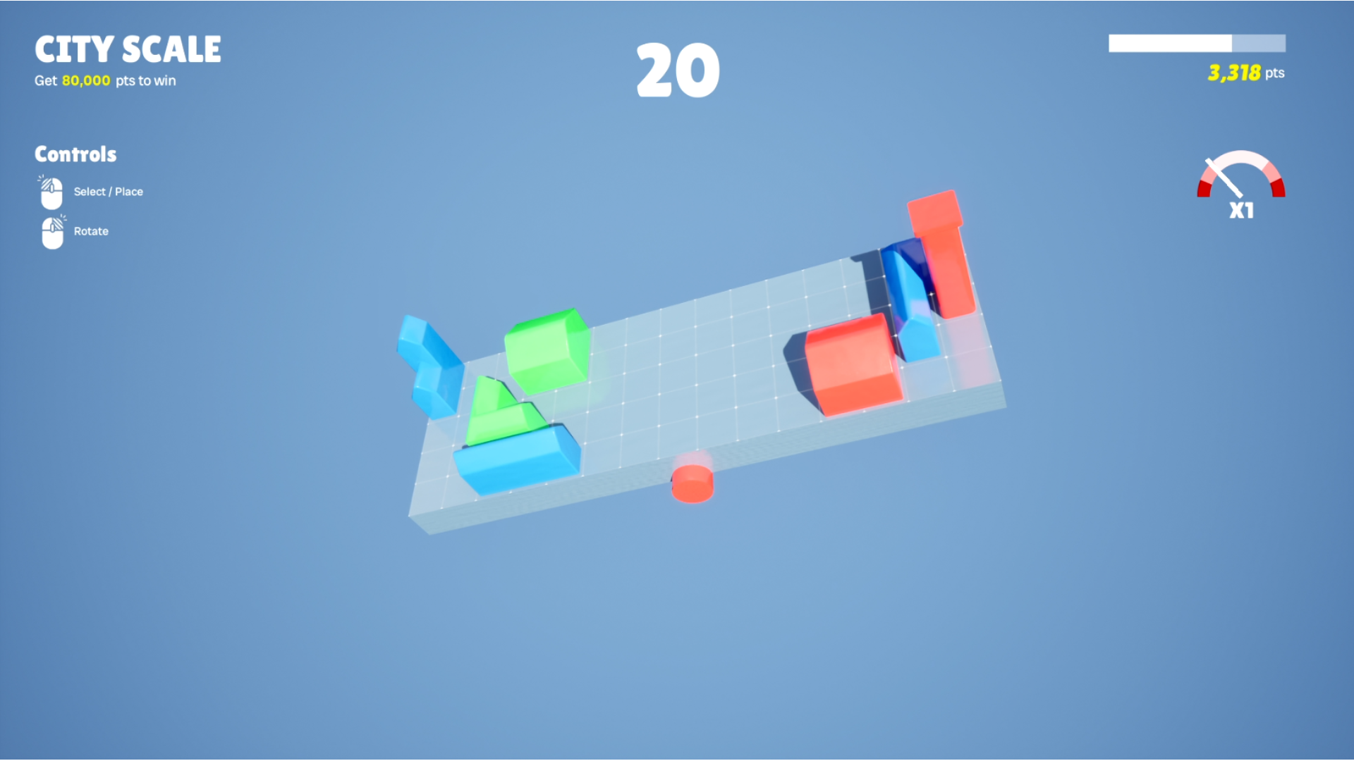 - Placer de petit bâtiments de couleurs sur une balance pour marquer des points. Les bâtiments placés aux extrémités de la balance rapportent plus de points. Des bâtiments adjacents de même couleur ne font aucun point. Vous perdez si la balance penche trop ou si le temps est écoulé.