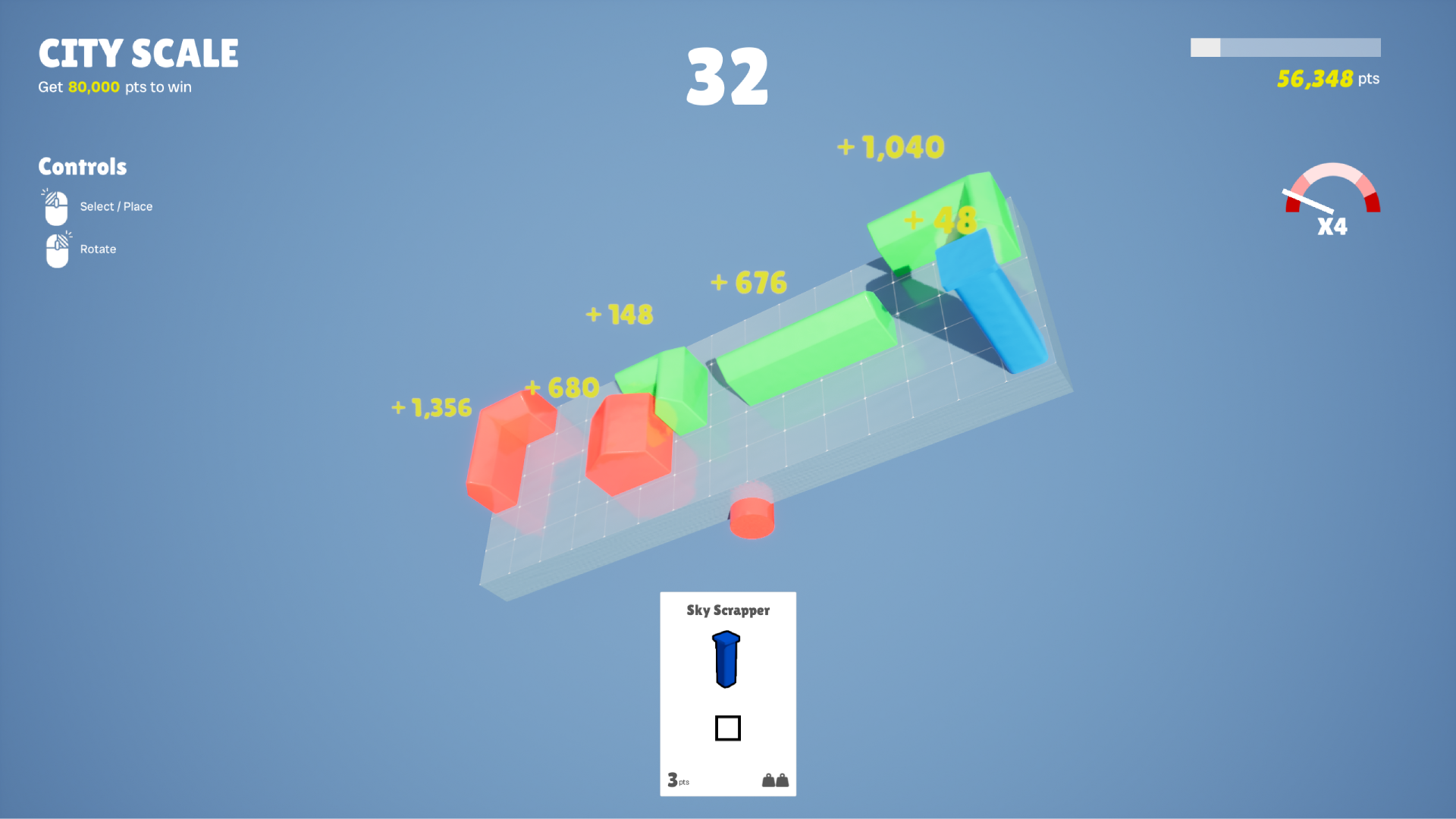 City Scale est un petit jeu développé pour le GMTK2024 game jam. Le jeu a été créé par une équipe de deux developpeur et le thème du game jam était Built to Scale. J’ai fait le game design, les elements visuels et le balancing du jeu.